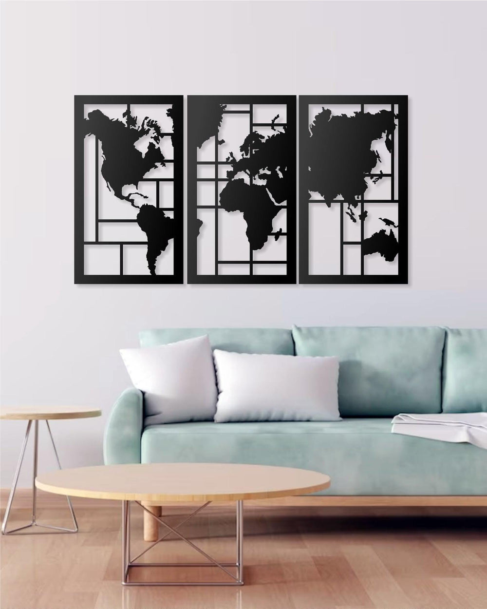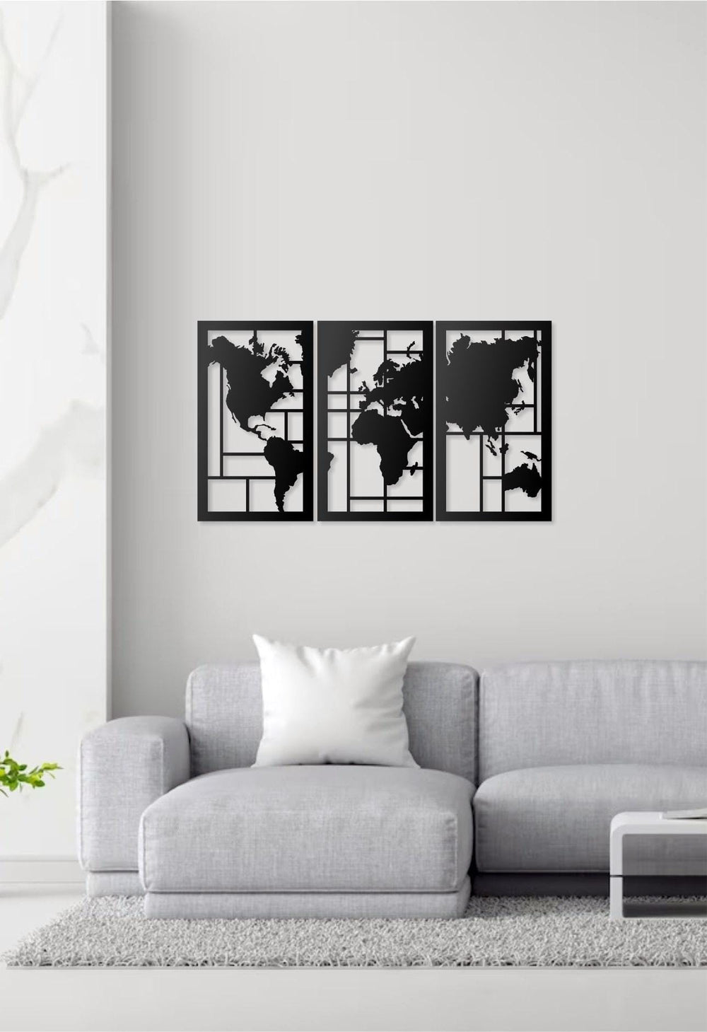 Canvas World Map Wall Art Metal - 3 Panel Triptych Wall Decor, Modern World Map Painting, Travel Gift, Living Room & Office Decoration
