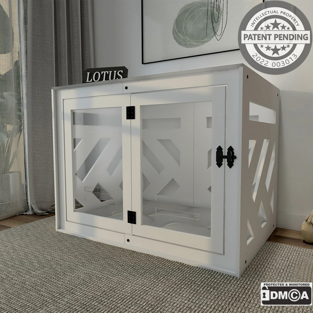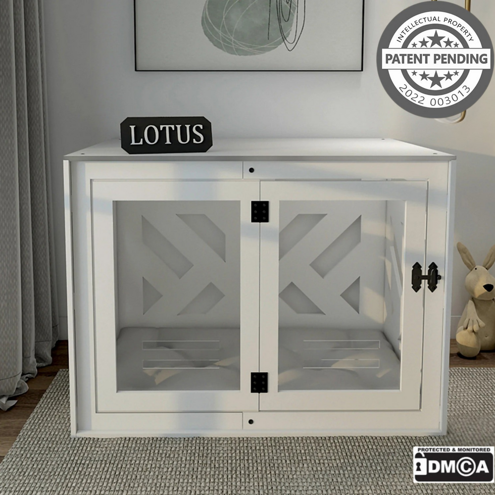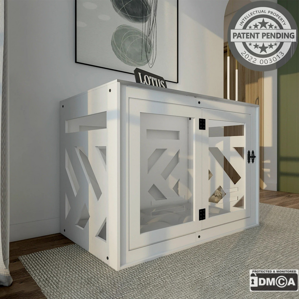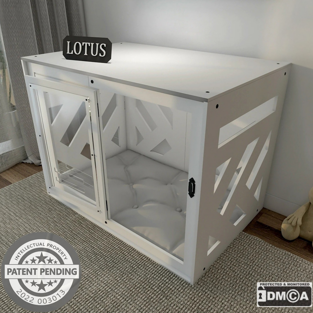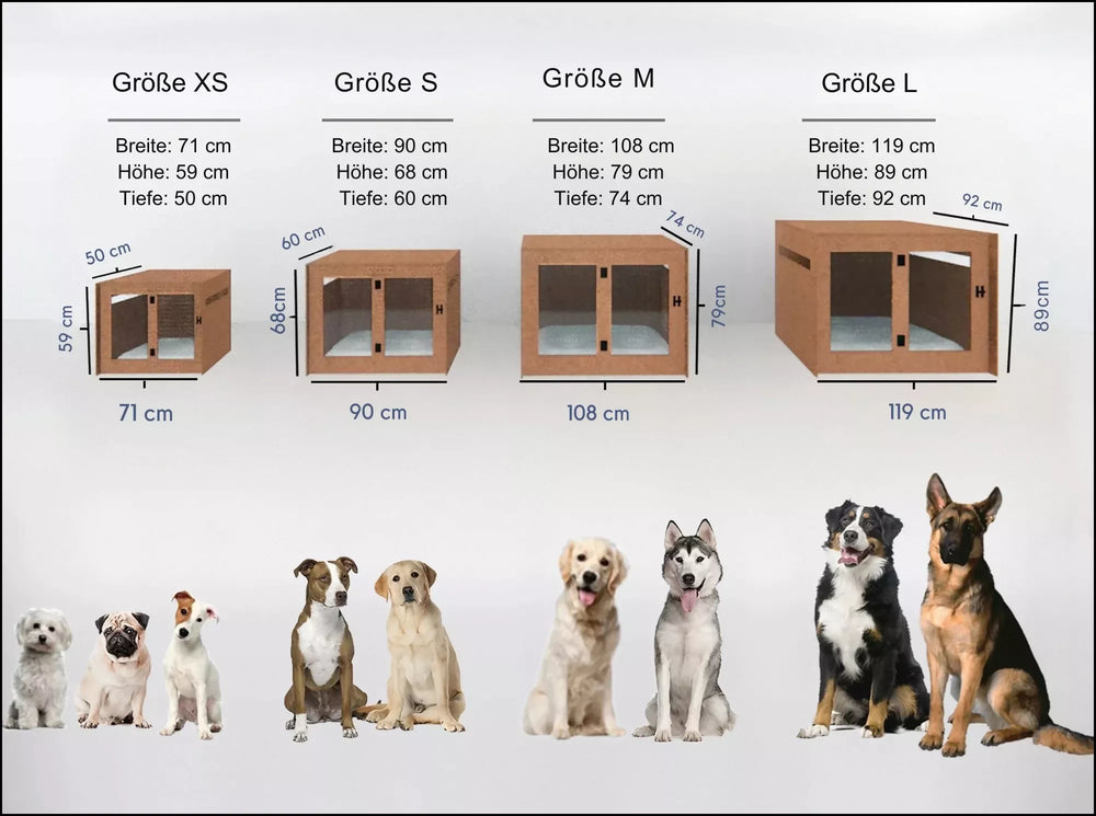 Hundehuette Belano B Weiss aus Holz mit personalisiertem Namensschild und Kissen