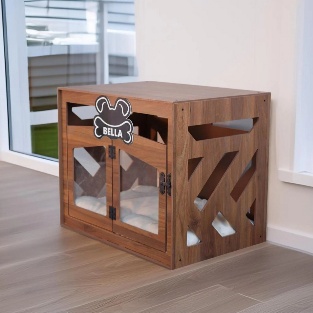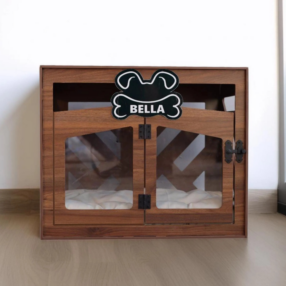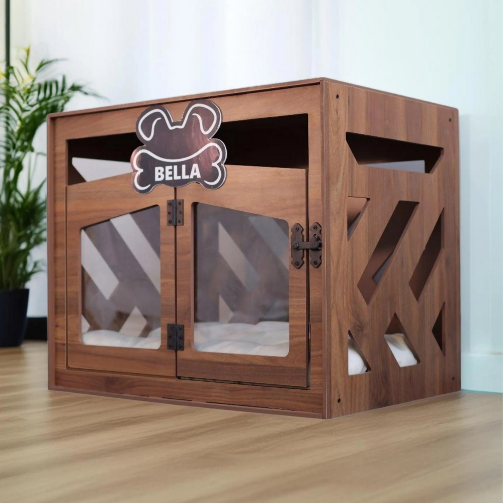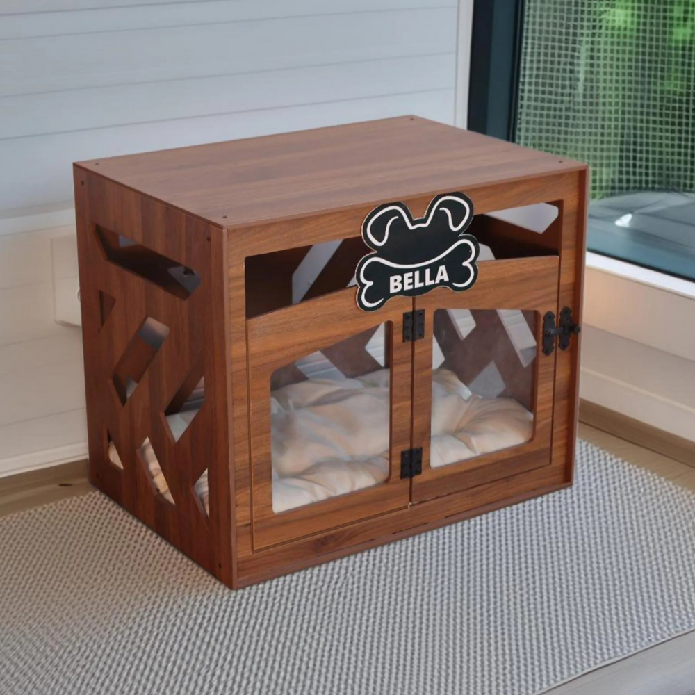 Hundehuette Pawloft B Walnuss aus Holz mit personalisiertem Namensschild und Kissen
