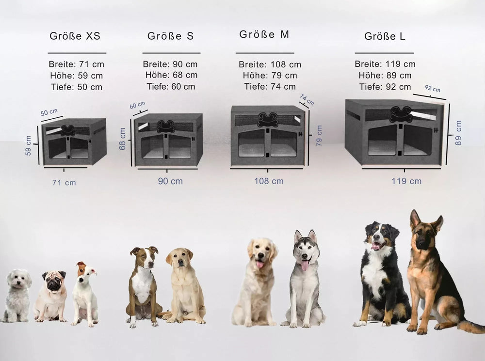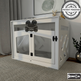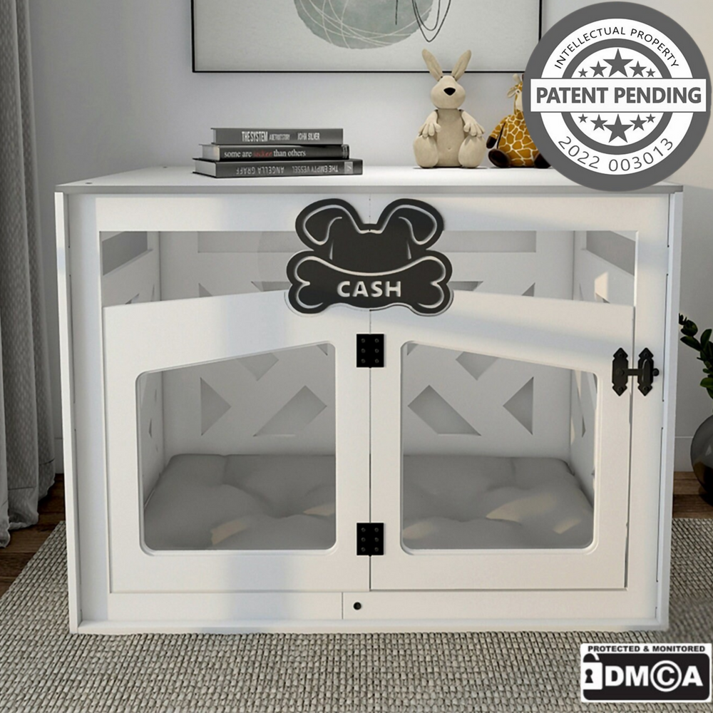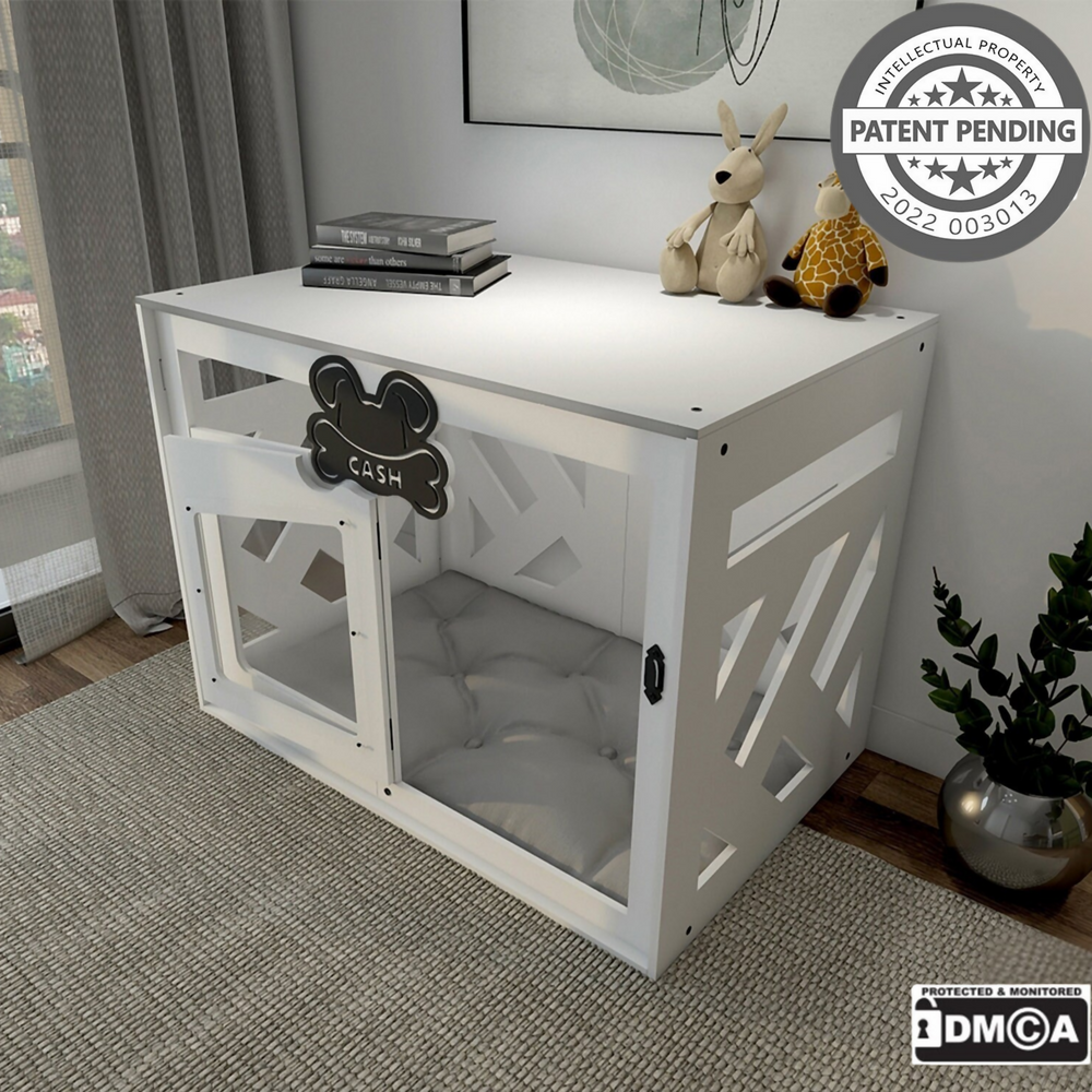 Hundehuette Pawloft B Weiss aus Holz mit personalisiertem Namensschild und Kissen