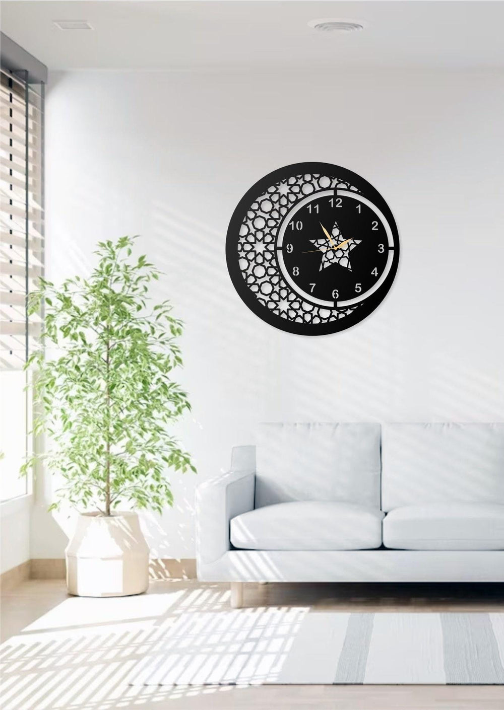 Islamic Metal Wall Clock with Ottoman Motif - Decorative Black Moon and Star Design for Home, Living Room, or Office Decor