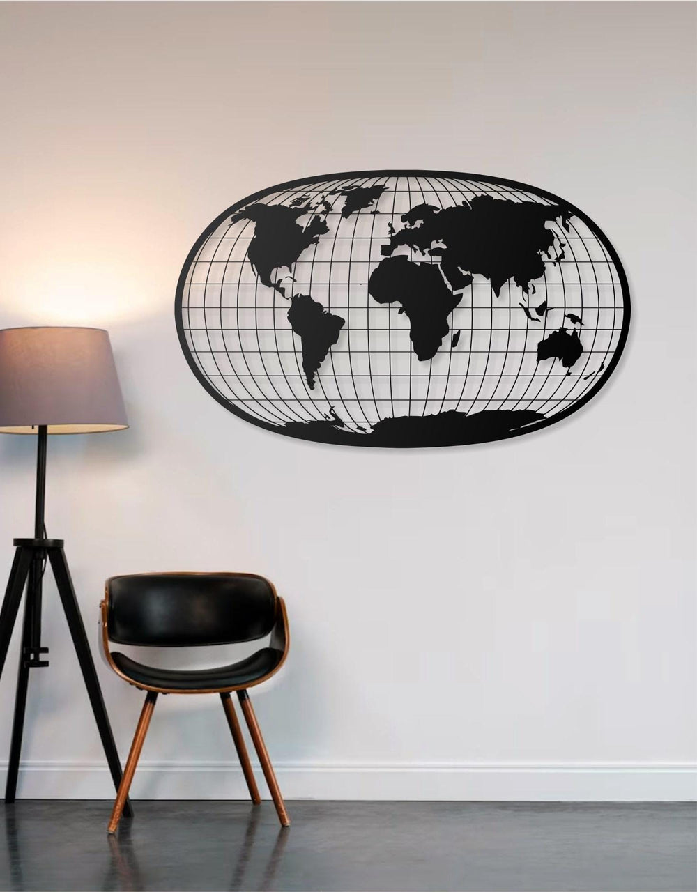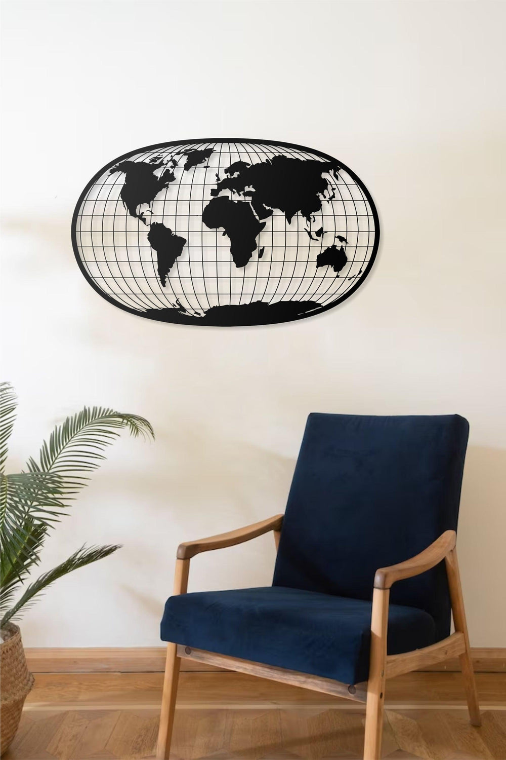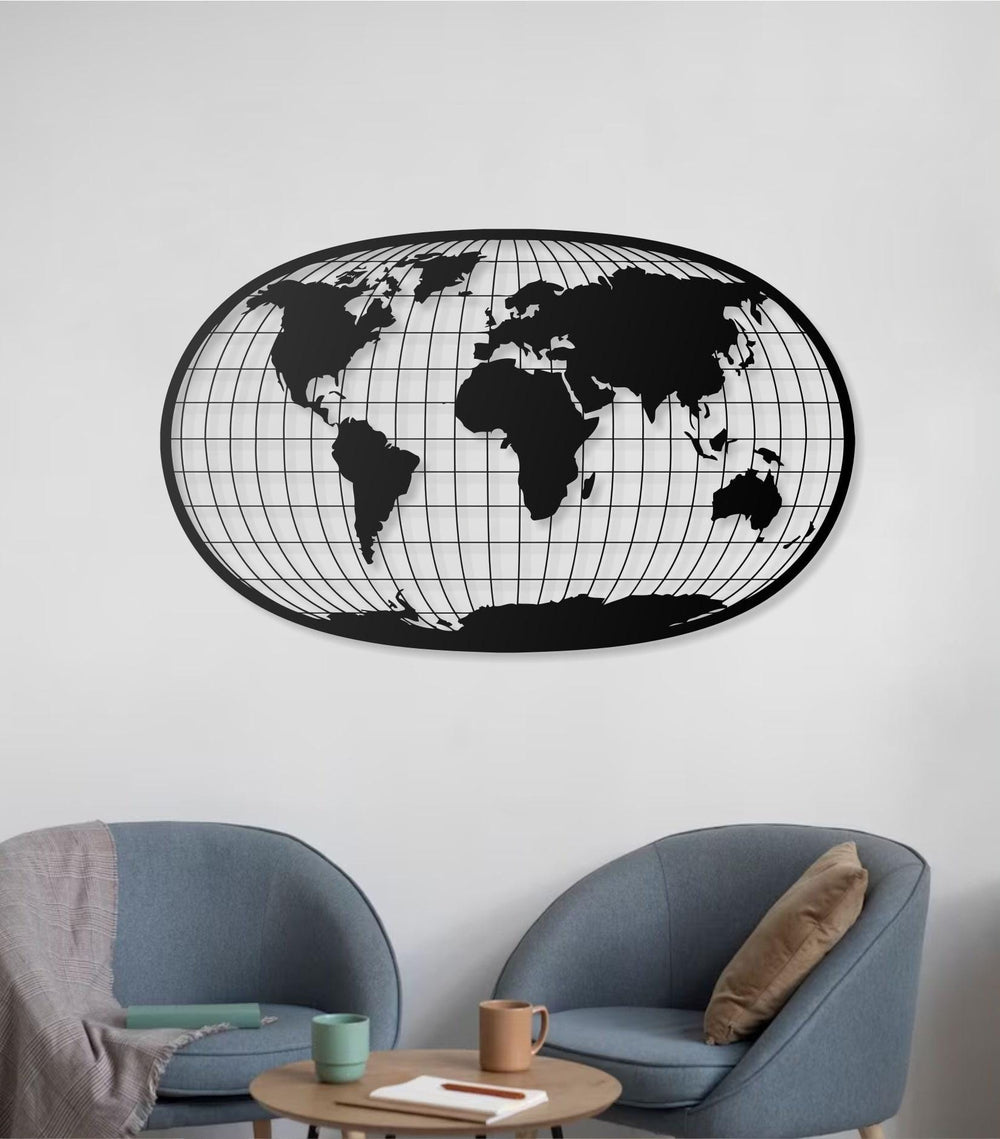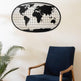 Metal World Map Wall Art Oval Geometric Design, Modern Metal Wall Decor, World Map Wall Hanging, Travel Gift, Home Office Decoration