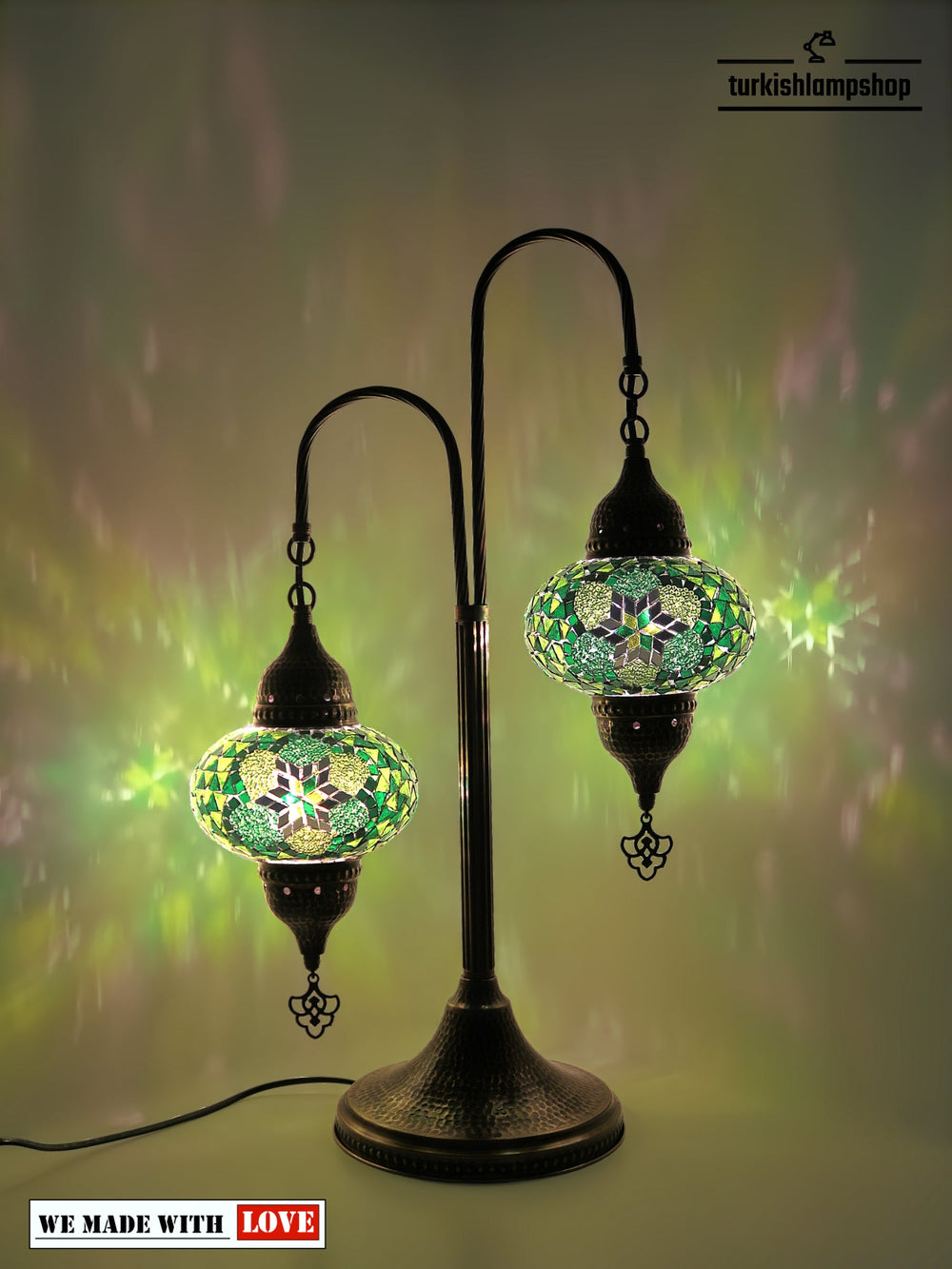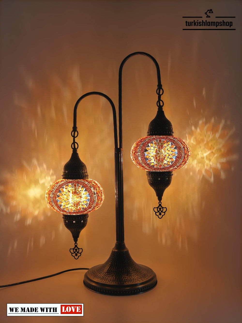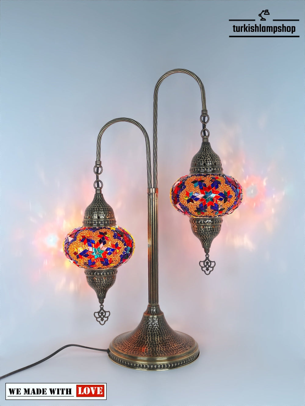 After that illuminate your space with this 2 globe turkish table handcrafted Turkish mosaic bedside lamp! Especially the two globe design produces a warm, inviting glow that will create a cozy atmosphere in any room. Thus perfect for any home décor, the unique colors of the mosaic glass will make a bold statement. For example enchanting and captivating, this bedside lamp is a must have!