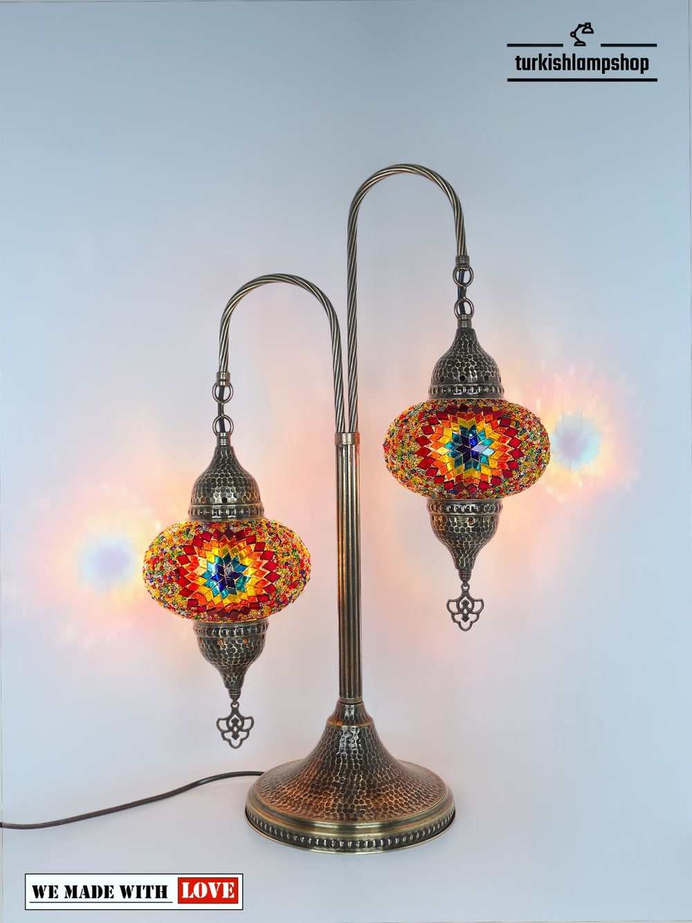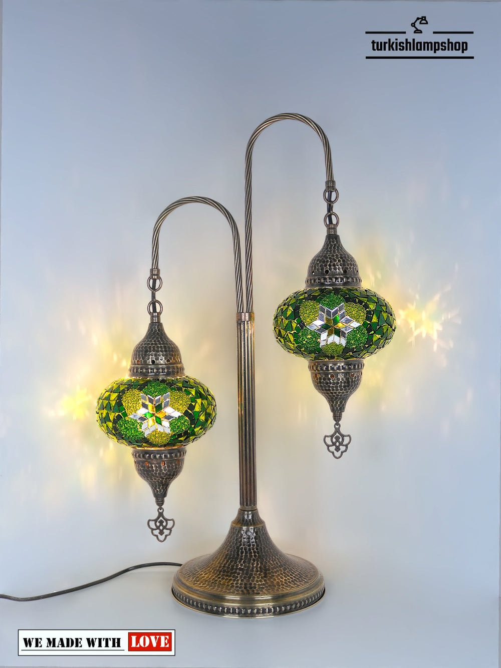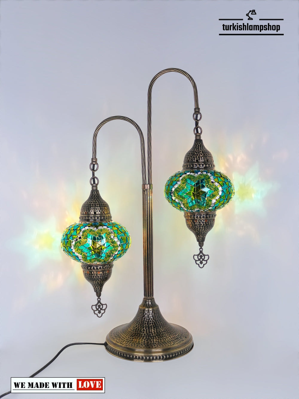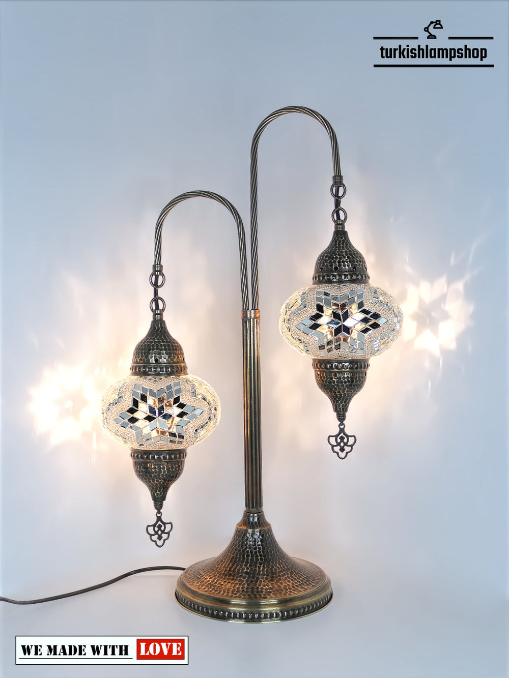 After that illuminate your space with this 2 globe turkish table handcrafted Turkish mosaic bedside lamp! Especially the two globe design produces a warm, inviting glow that will create a cozy atmosphere in any room. Thus perfect for any home décor, the unique colors of the mosaic glass will make a bold statement. For example enchanting and captivating, this bedside lamp is a must have!