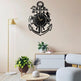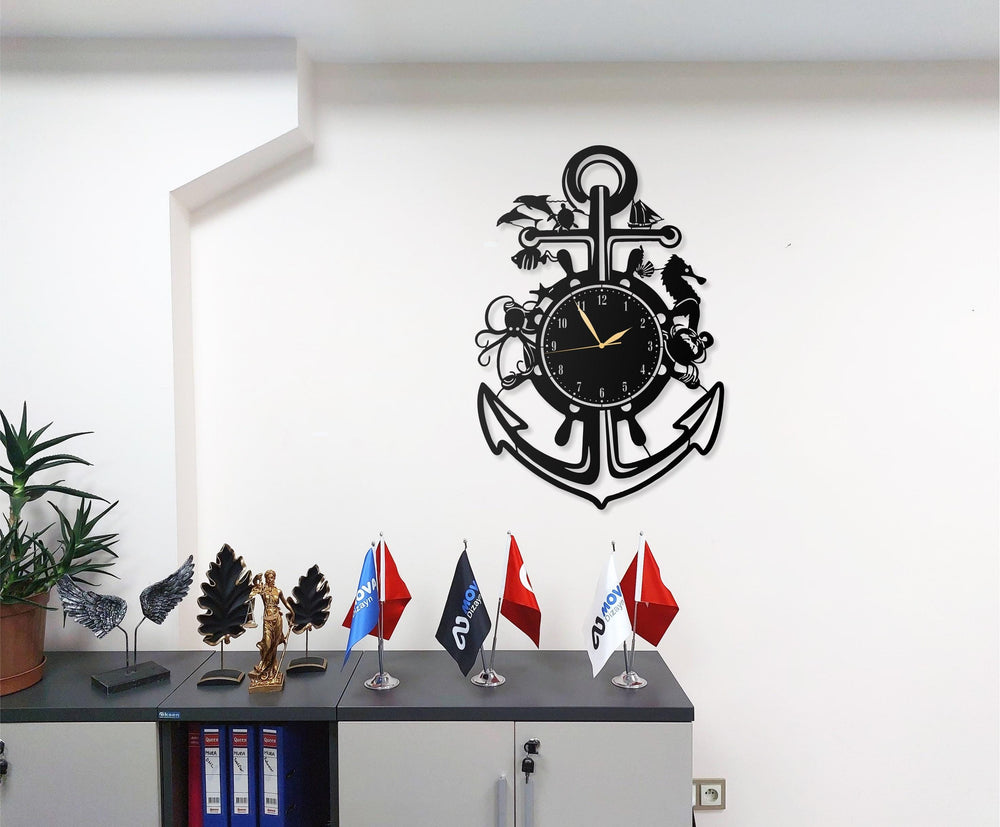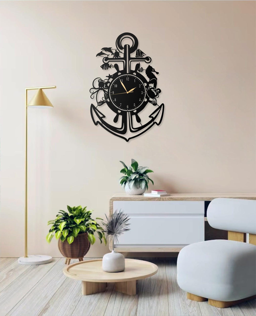 Nautical Anchor Metal Wall Clock with Sea Life Design - Black - Decorative Large Wall Clock for Living Room, Office, and Beach House Decor